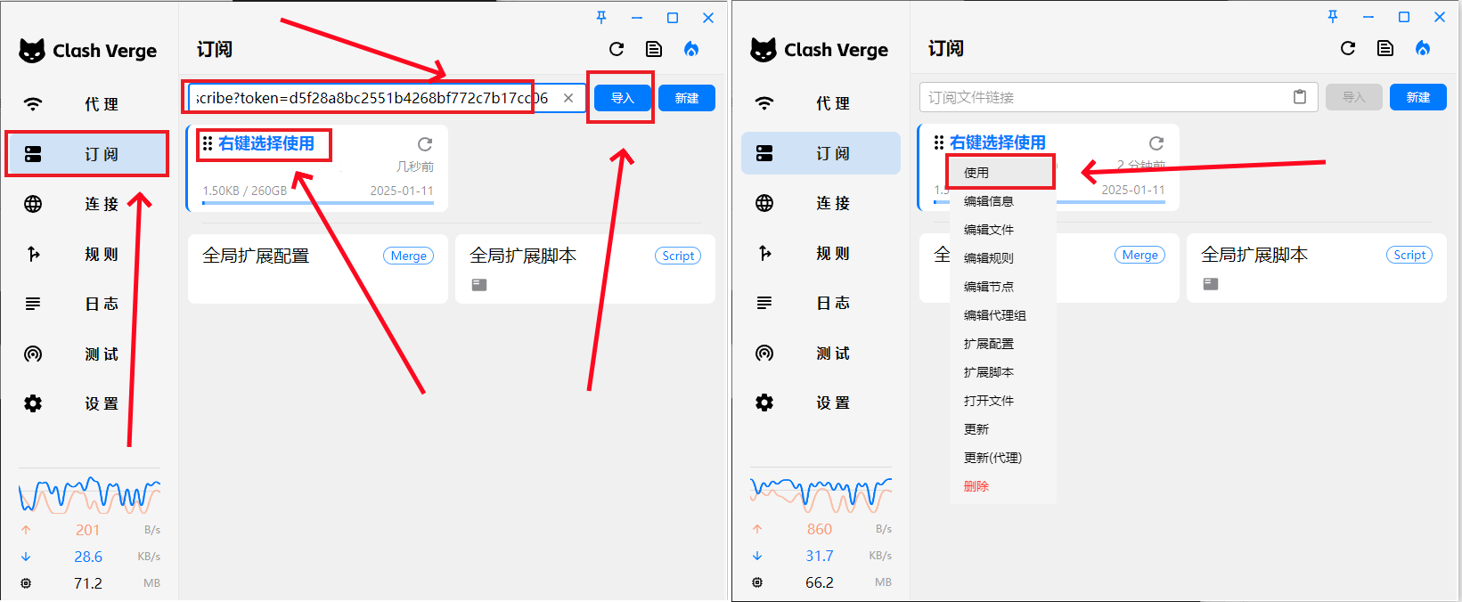 2. 打开 [Clash Verge]将复制的订阅文件链接粘贴到Clash Verge后点击右边的[导入]随后右键导入的订阅选择 使用